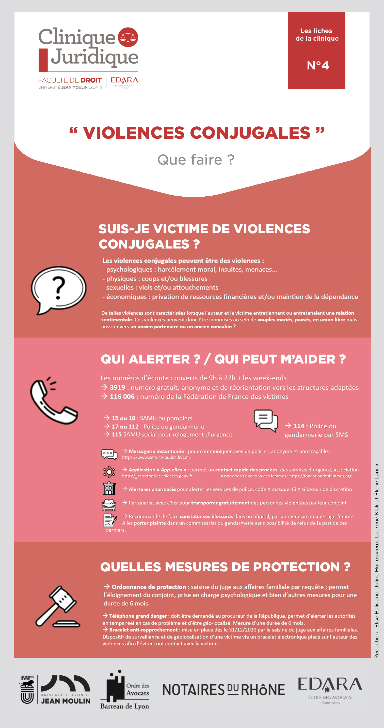- Ordonnance de protection : saisine du juge aux affaires familiale par requête ; permet l'éloignement du conjoint, prise en charge psychologique et bien d'autres mesures pour une durée de 6 mois.