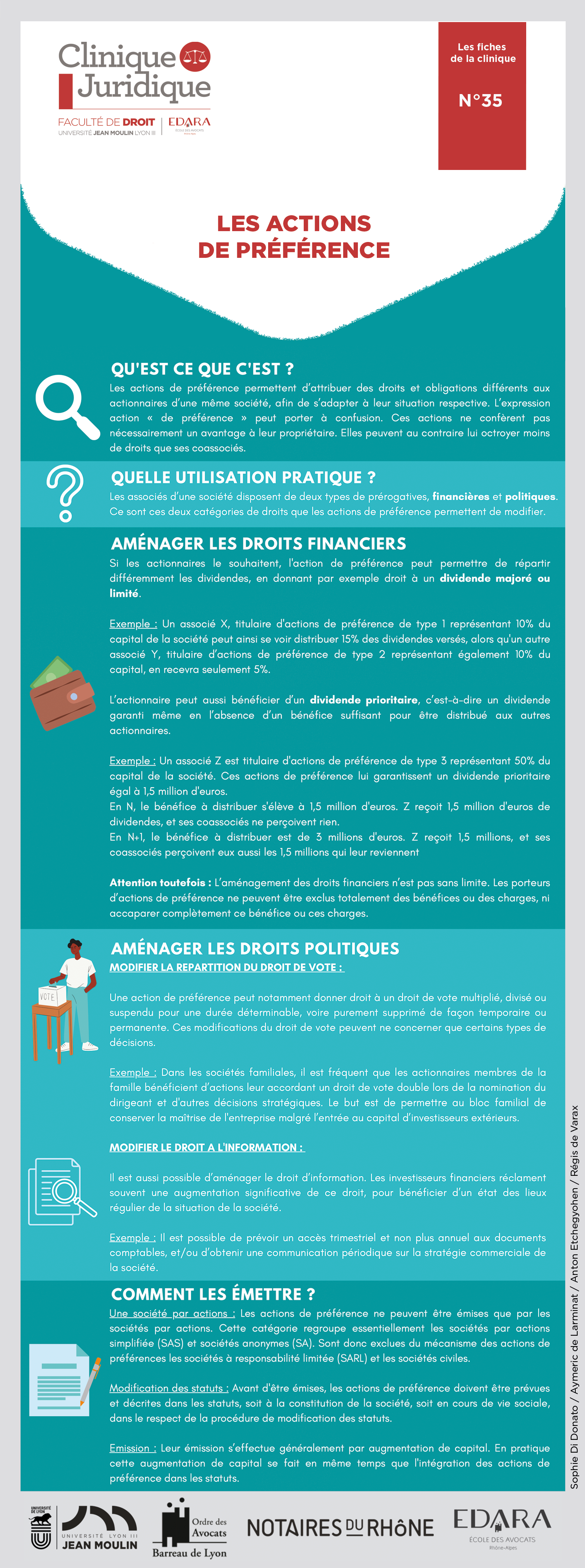 Les actions de préférence permettent d’attribuer des droits et obligations différents aux actionnaires d’une même société, afin de s’adapter à leur situation respective. L’expression action « de préférence » peut porter à confusion. Ces actions ne confèrent pas nécessairement un avantage à leur propriétaire. Elles peuvent au contraire lui octroyer moins de droits que ses coassociés.